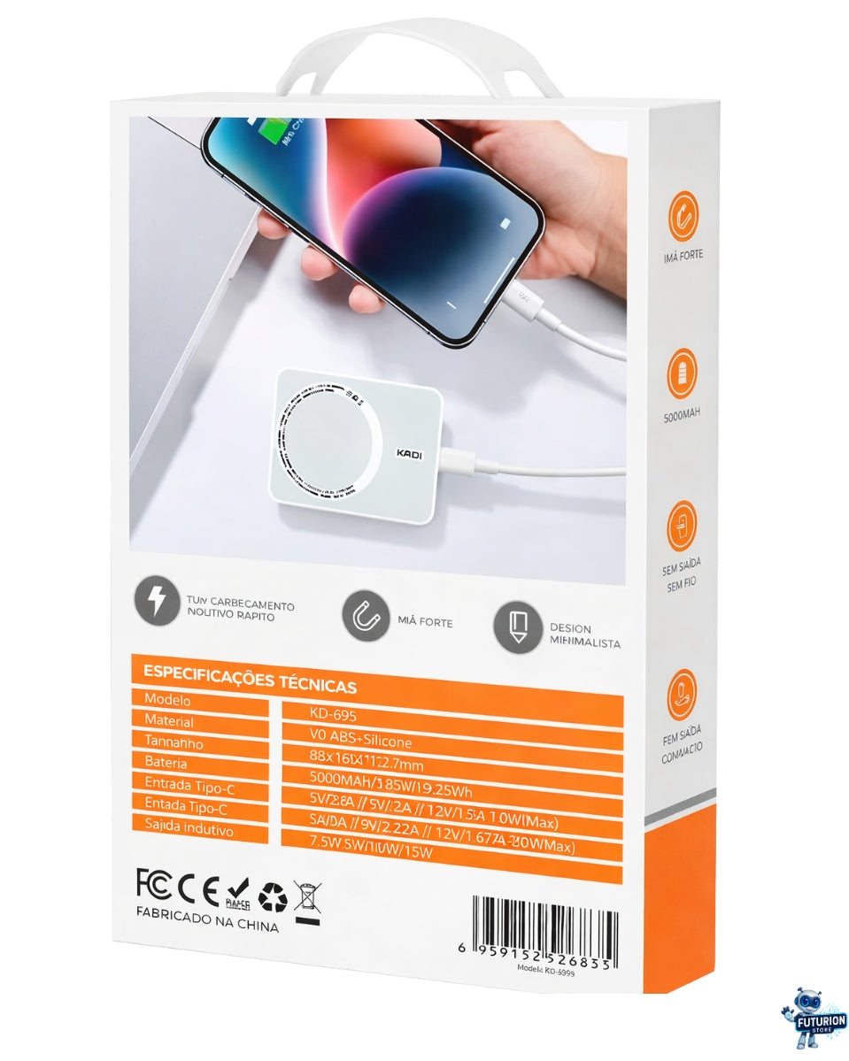O Power Bank por Indução Kaidi KD-995 foi desenvolvido para quem busca praticidade, eficiência e mobilidade no dia a dia. Com capacidade de 5000mAh, ele garante energia extra para o seu smartphone sempre que você precisar.